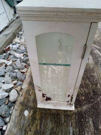 Small nick-nack cabinet, with one shelf, glass front and sides, $10 buys it. Call Size; 10"x 10"x 4"