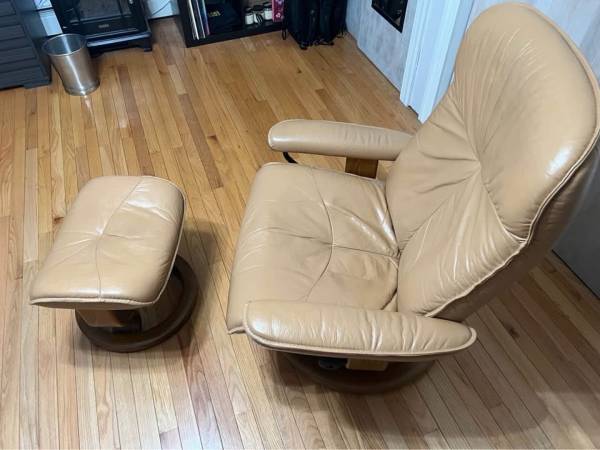 Comparable new Stressless leather recliner and ottoman sets retail around $3,000. Offered here for $1,000, this represents significant savings on a premium, long-lasting piece known for comfort, craftsmanship, and iconic Norwegian design. Opportunities like this are uncommon and it won’t last long.