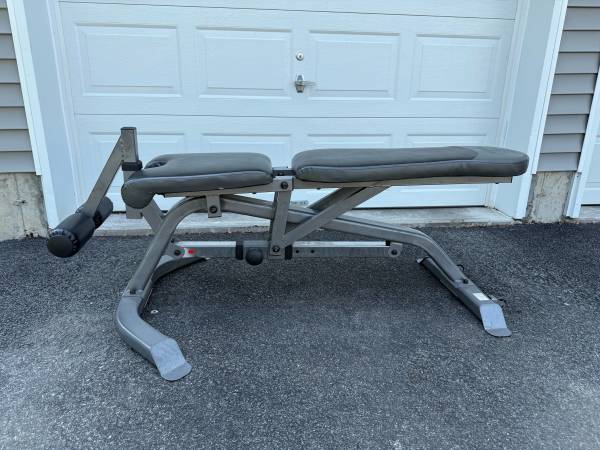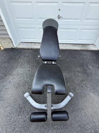 Fully adjustable weight bench. Pads are in Excellent condition. Very comfortable. This bench is solid and stable and comes with wheels for easy mobility 5 different adjustments Flat, incline,...