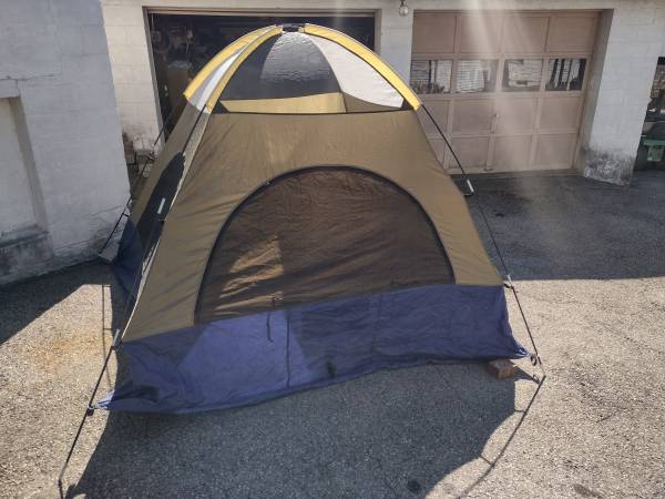 Eureka four-way 886 2-4 person dome tent. Comes with carrying bags, 4 tent stakes. Also full coverage rainfly for weather protection. Two large side vents also bottom vent under door opening.
